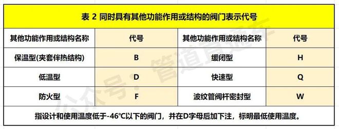 当阀门又同时具有其他功能作用或带有其他结构时,在阀门类型代号前再加注一个汉语拼音字母,典型功能代号按表2的规定。